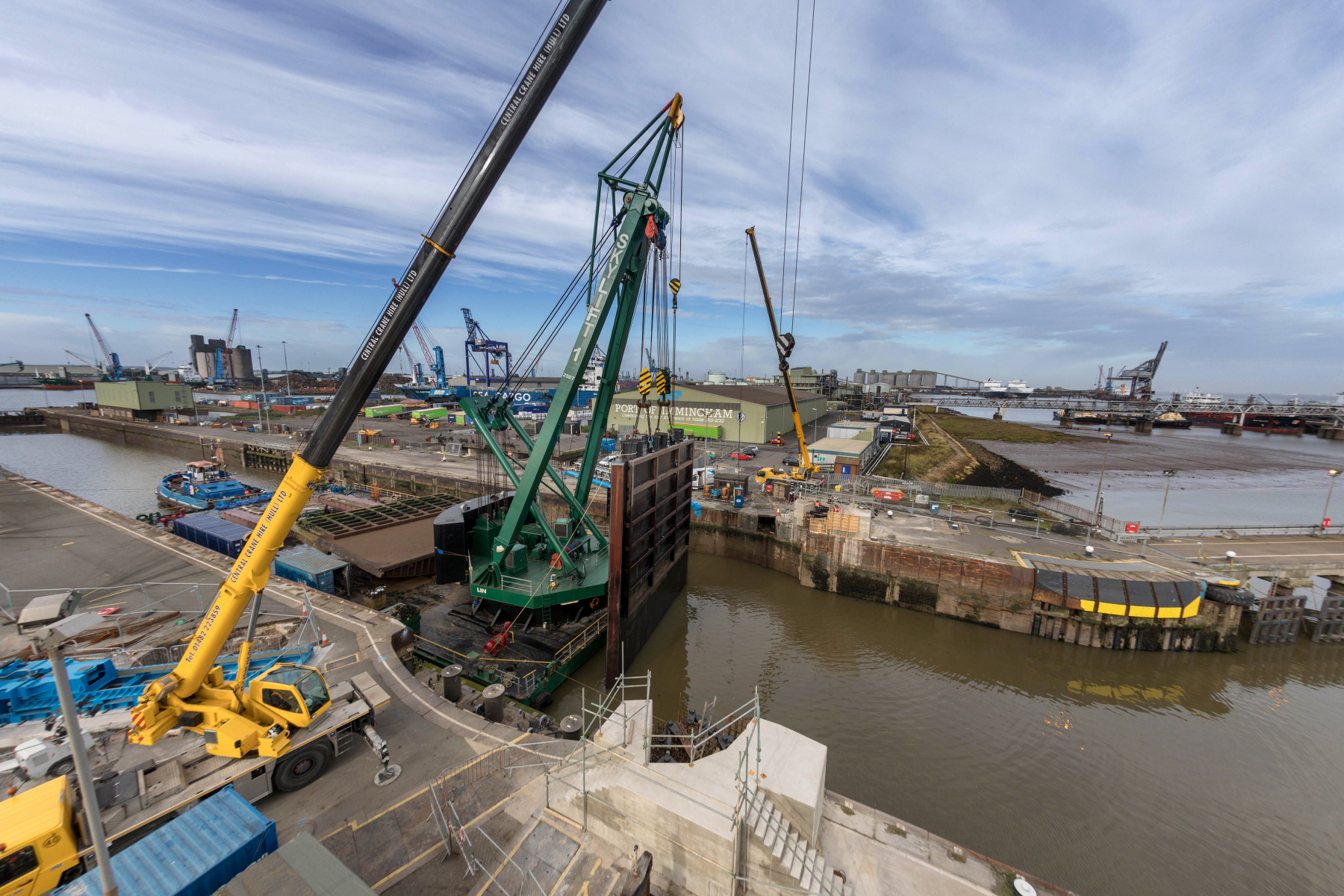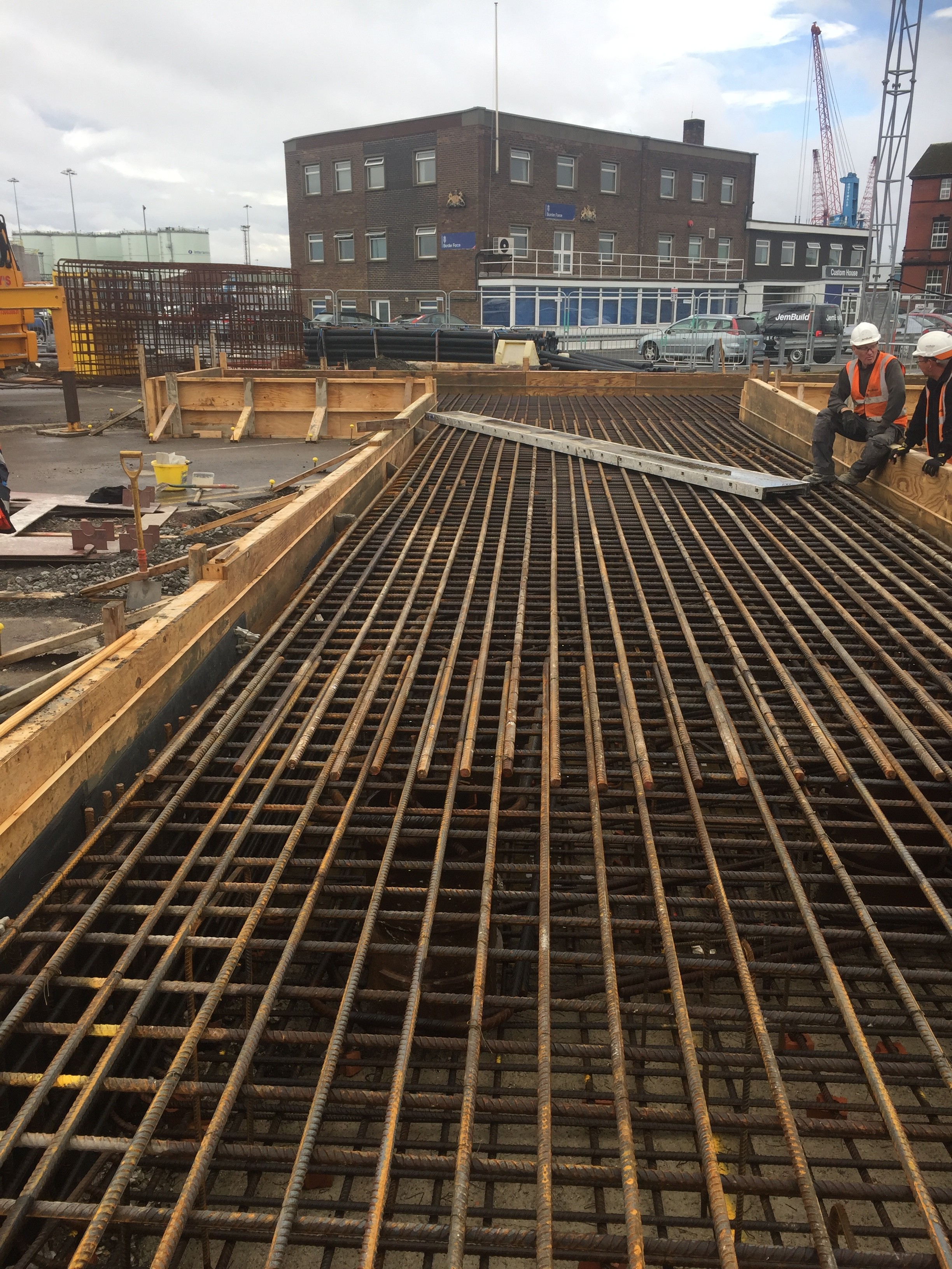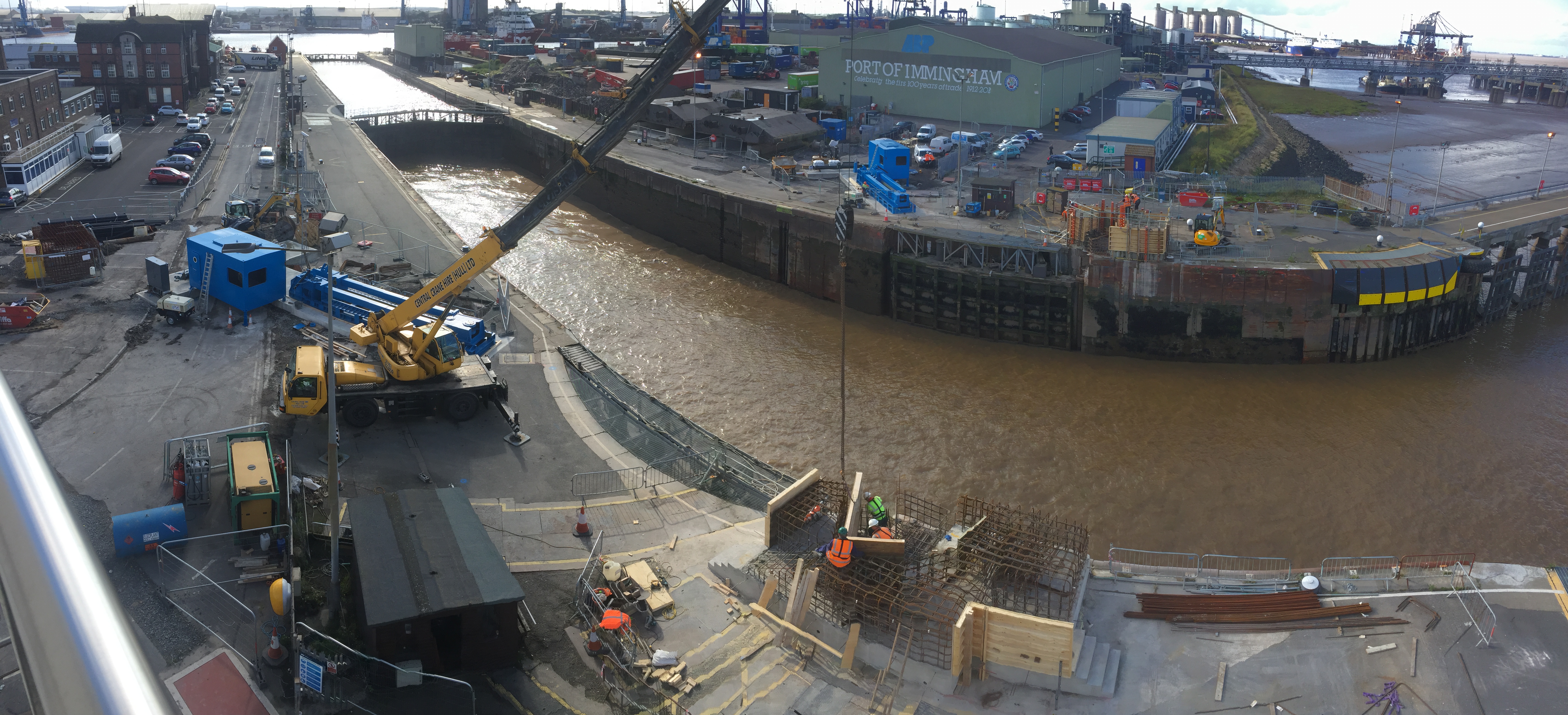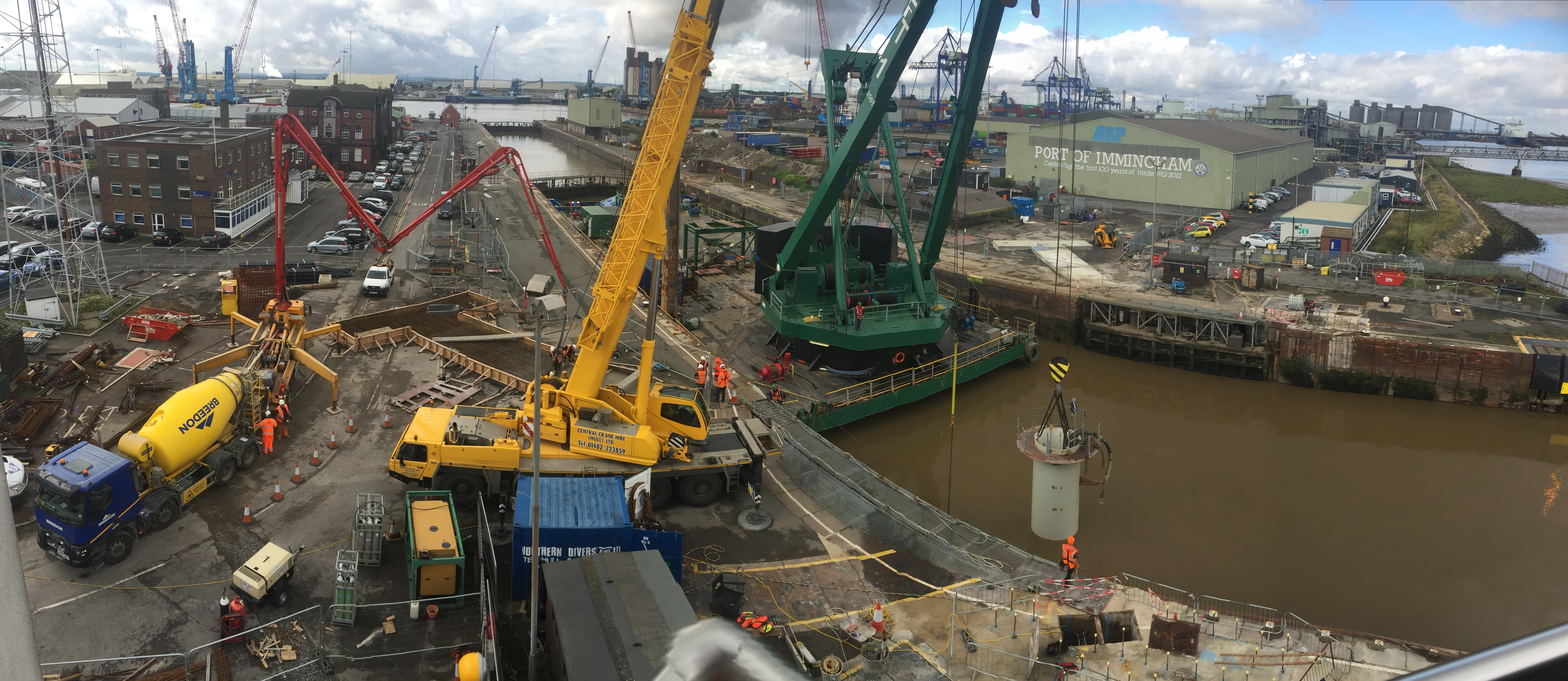 Following the completion of this contract and working in partnership with Ravestein Marine the second phase of the project involved the construction of piled foundations to facilitate the new lock gates. Works were demanding,harzardous and very challenging on site working directly on the lock side between daily live shipping movements. Four 150m3 foundations complete with 80 tons of reinforcement were constructed to accommodate the main rams and top anchorages. Within these works, troughs were installed for hydraulic pipes and concrete supplied and laid to the dock bottom in preparation for the installation of the new lock gates.