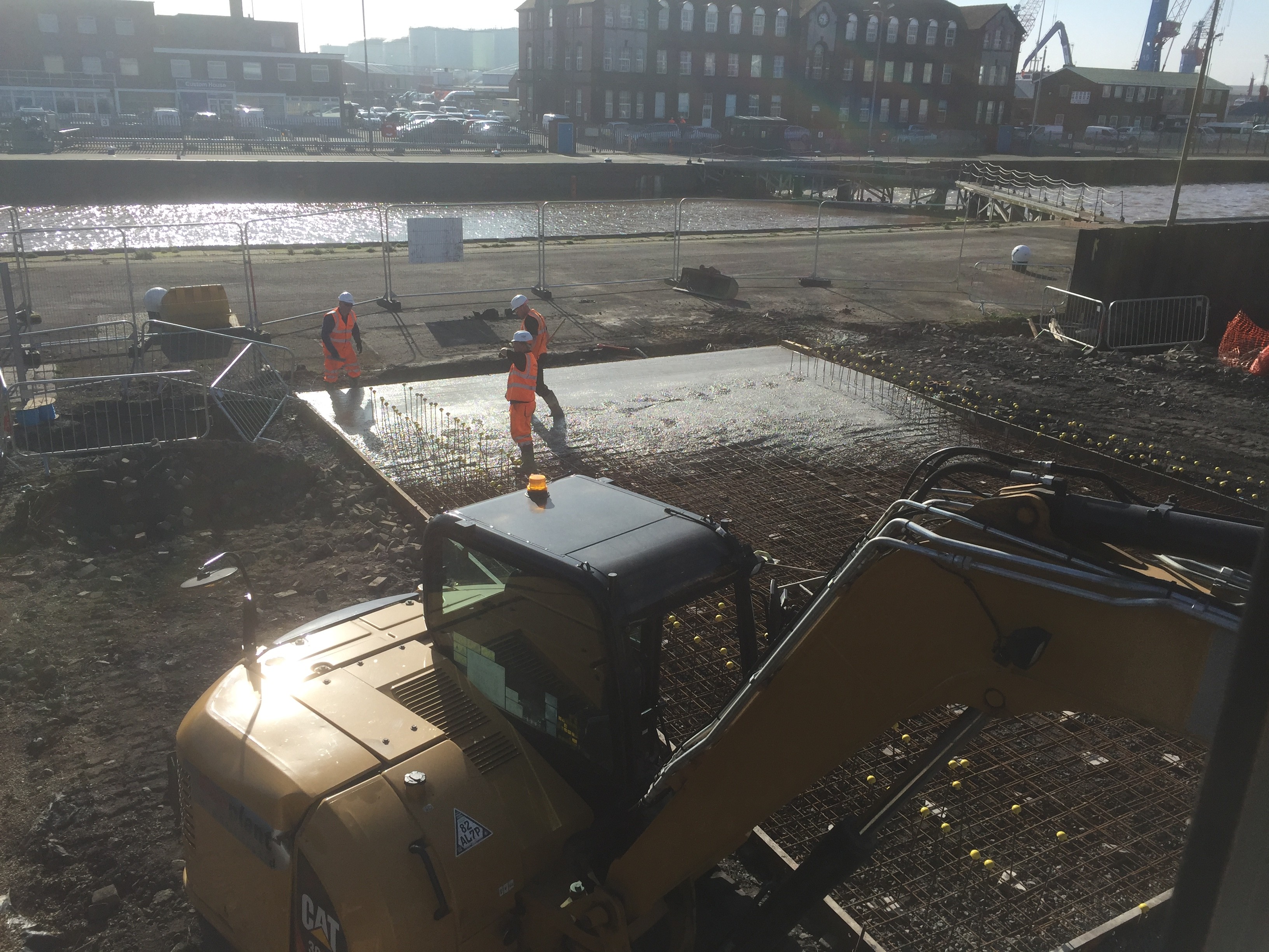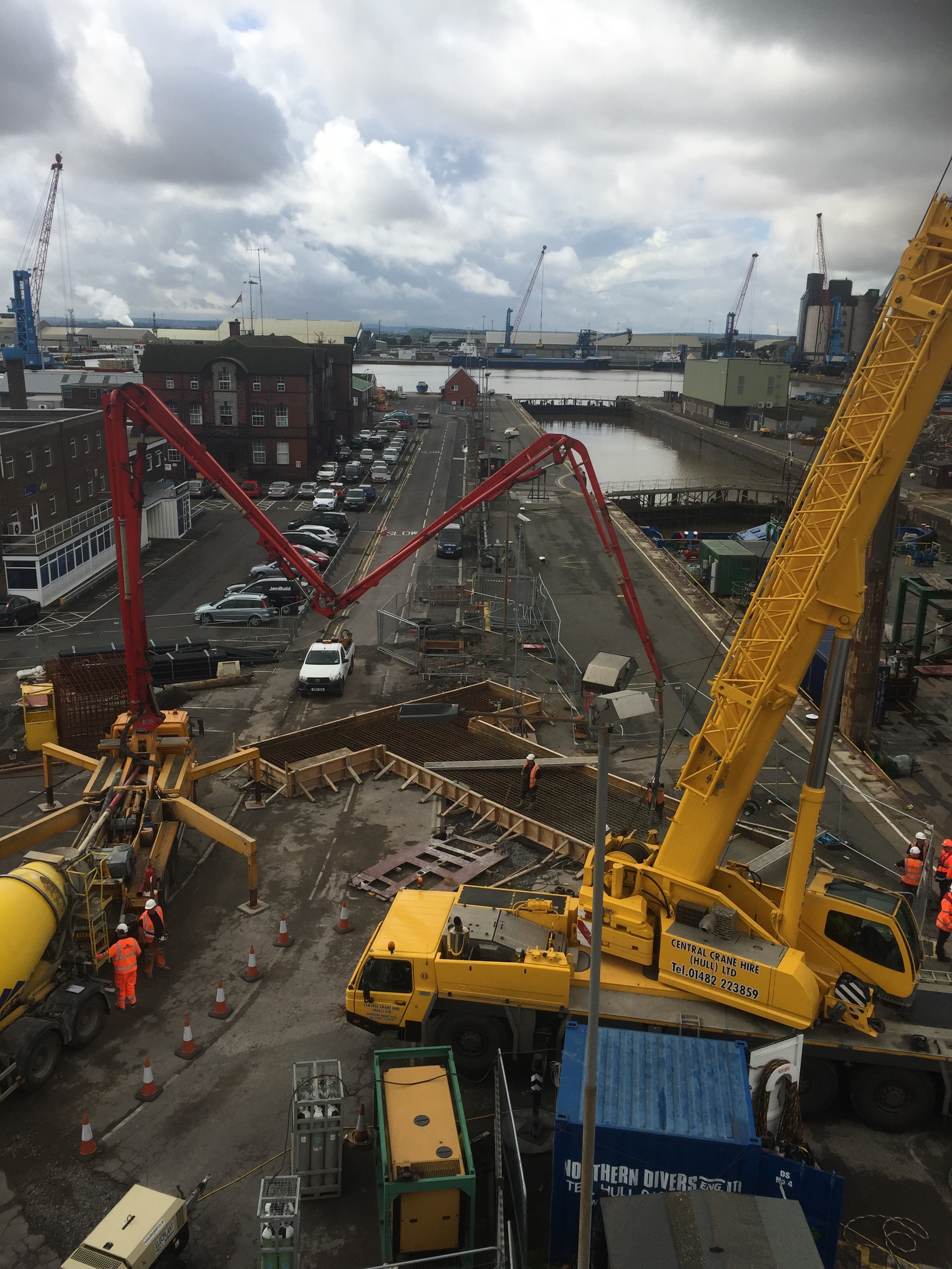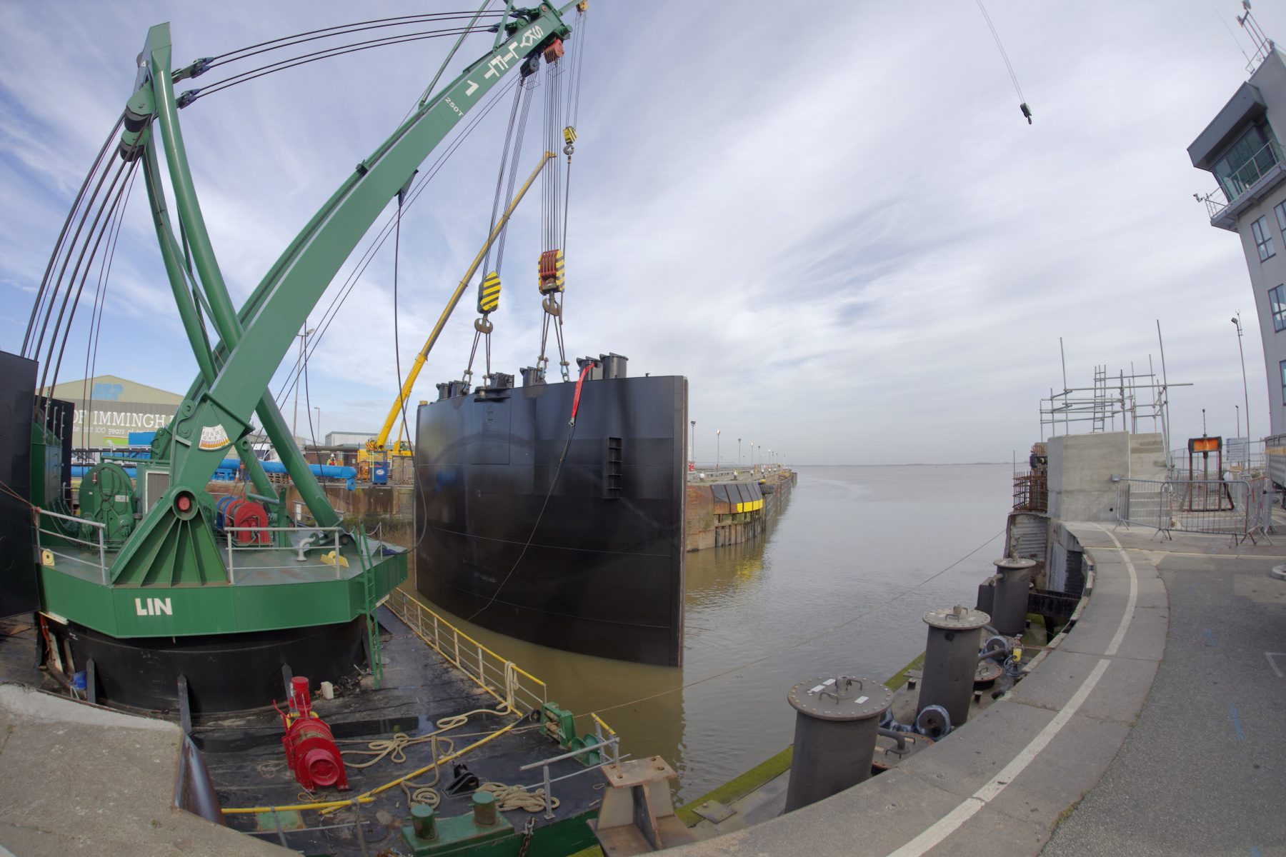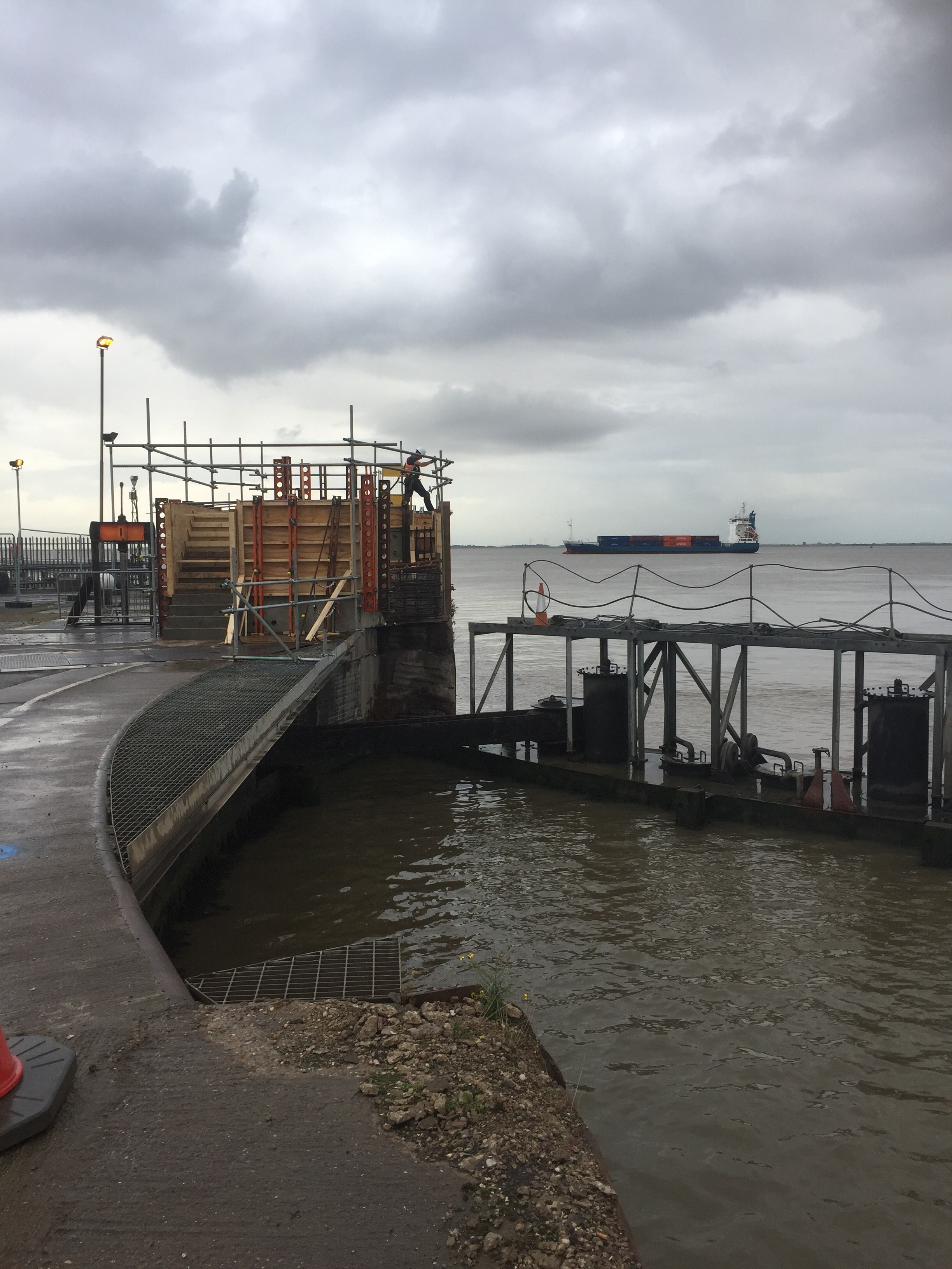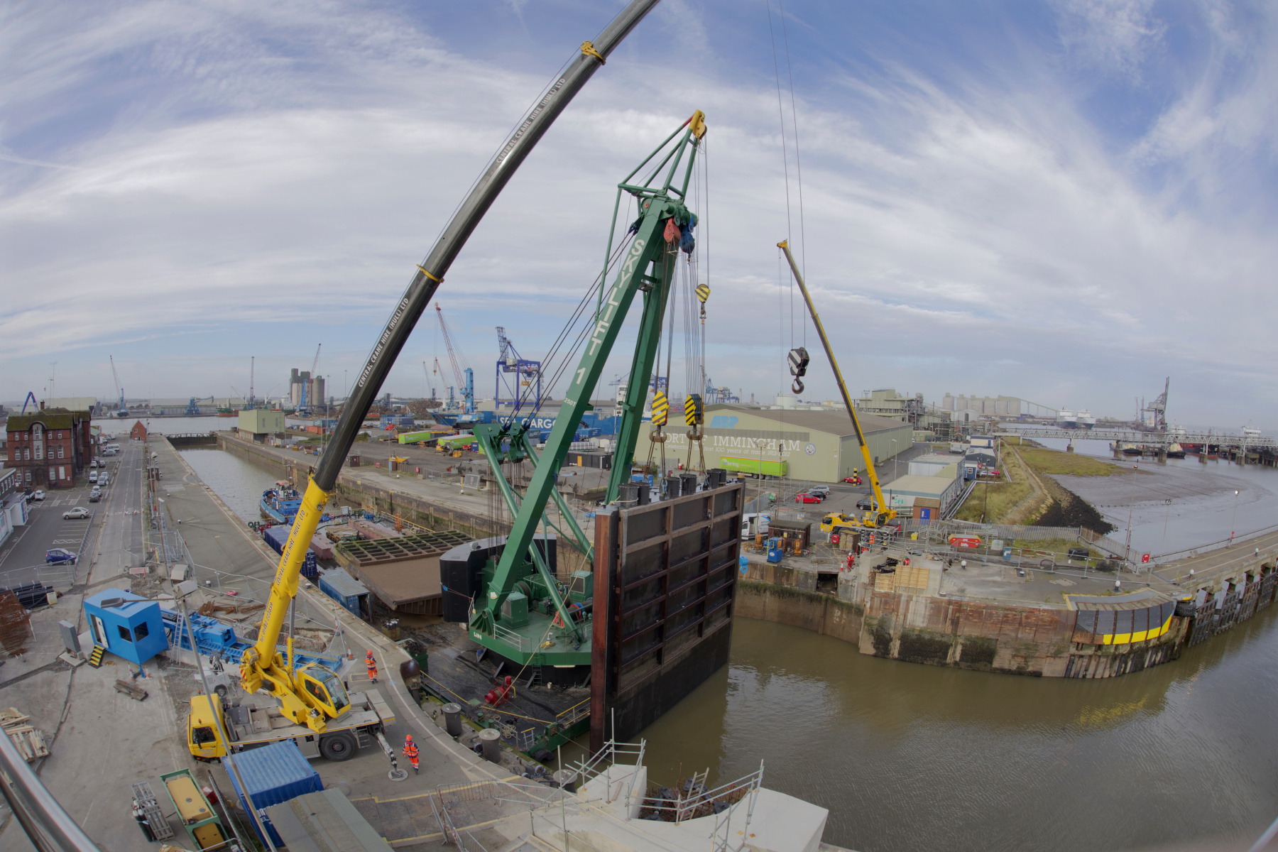 Following the completion of this contract and working in partnership with Ravestein Marine the second phase of the project involved the construction of piled foundations to facilitate the new lock gates. Works were demanding,harzardous and very challenging on site working directly on the lock side between daily live shipping movements. Four 150m3 foundations complete with 80 tons of reinforcement were constructed to accommodate the main rams and top anchorages. Within these works, troughs were installed for hydraulic pipes and concrete supplied and laid to the dock bottom in preparation for the installation of the new lock gates.