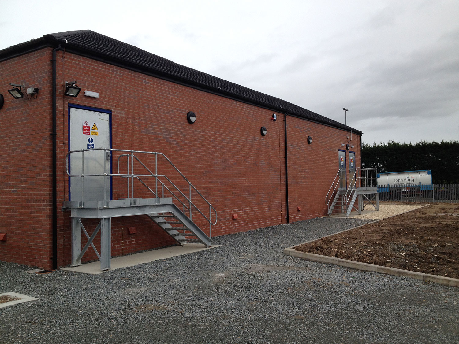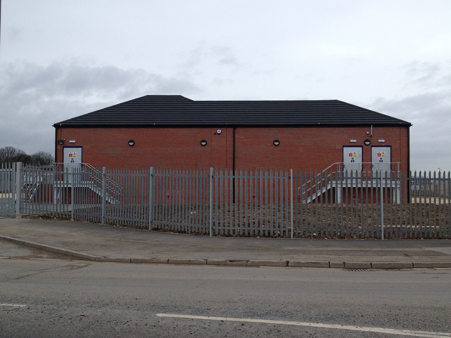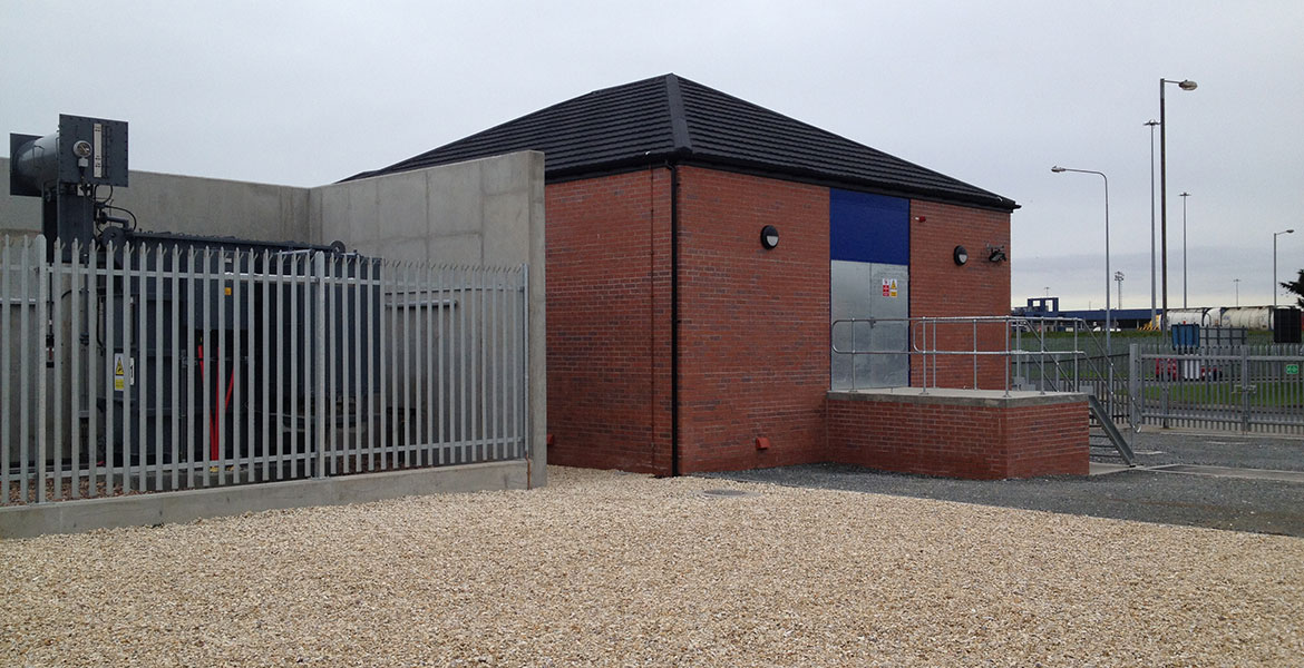 The project consisted of the construction of a major substation to power the new Siemens wind turbine facility on Alexandra Dock in Hull. Built off a reinforced concrete raft foundation with an internal raised concrete floor on metal deck supported by internal blockwork walls forming the duct and cable trenches. External walls were traditional masonry built with a traditional timber trussesd steel tiled roof. Internally cable trenches were fitted with lightweight GRP flooring panels. Galvanised stairs and concrete landings where constructed externally to provide access to the doors.