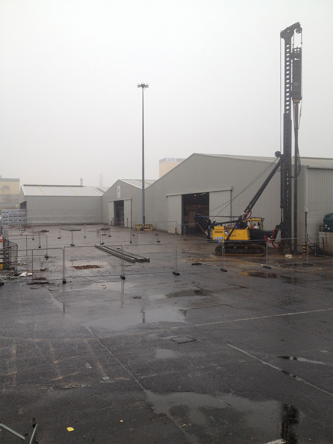The extension consisted of a twin span steel portal frame (maximising floor space for timber storage), cladded to the roof and side walls, with an open frontage. The steelwork was erected on reinforced concrete pad foundations which were constructed on precast concrete piles.